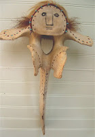 THE BRIDE IS MADE FROM AN OLD GREAT GRAY WHALE VERTEBRAE. SHE HAS OLD BEADS AROUND HER HEAD WITH TIMBERWOLF AND BEAR HAIR. HER FACE IS SCRIMSHAWED AND INSET WITH SILVER BEAD EYES. OLD BEADS & SILVER ARE INSET INTO THE BONE AND DOWN AROUND HER FRONT. THE BRIDE MEASURES; 18" HIGH X10 1/2" WIDE X 8 " DEEP. 2100.00