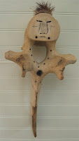 THE GROOM IS MADE FROM AN OLD GREAT GRAY WHALE VERTEBRAE & IS THE MATE TO THE BRIDE. HIS FACE IS SCRIMSHAWED AND INSET WITH JET BEADS. THE BEADS ALSO GO DOWN HIS SIDES.... A FEW MISSING... AND HIS MEDAL IS MADE OF ABALONE SHELL SURROUNDED BY VERY TINY BEADS. THESE TINY GLASS BEADS ARE ALSO AROUND HIS WAIST.