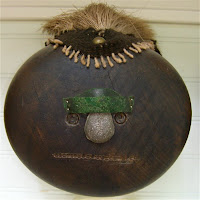 JU-JU IS THE GUARDIAN THAT PROMPTS OUR AWARENESS TO STAND IN AWE OF SIMPLICITY. A SINGLE LINE, LOOKED UPON WITH SINGULAR CONCENTRATION, DISSOLVES AND TRANSFORMS INTO ANOTHER THING. JU-JU- FREES THE RESTRAINTS WHICH HAS BOUND YOUR CREATIVITY. 8" HIGH X 8" WIDE X 6" DEEP. MATERIALS; WOOD, CARVING, METAL, LEATHER, CARIBOU HAIR, YARNS, AND BRASS. 800.00