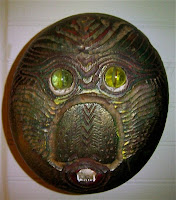 SKWE-LU IS THE GUARDIAN THAT NURTURES US AT THE FIRST STAGE OF METAMORPHASIS & SHOWS TO US WHAT WE CANNOT SEE. THIS INTRODUCTION TO OURSELVES IS AS A TADPOLE IS TO A FROG.  THIS GUARDIAN IS A MASTER TEACHER OF LIMITLESS POSSIBILITIES AND ANNIHILATES PRE-MEDITATED THOUGHTS WHICH HINDER OUR SPONTENAITY. MATERIALS; WOOD, PIGMENTS, CARVING AND GLASS.  800.00